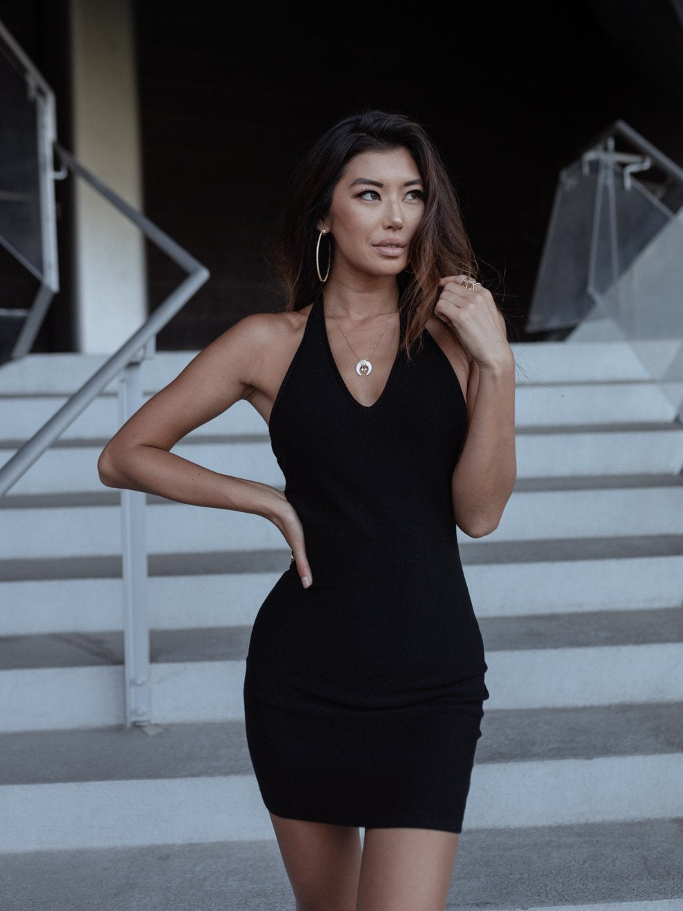 This sleek mini dress is a modern date night go-to. The stretch fabrication creates a form-fitting silhouette for accentuating your curves, while the halter-style top creates a flattering neckline and results in a perfectly adjustable fit. When the sun goes down, slip on the coordinating long sleeve cropped cardigan for cozy appeal. To really nail high-low chic, style yours with a casual baseball hat and statement earrings.